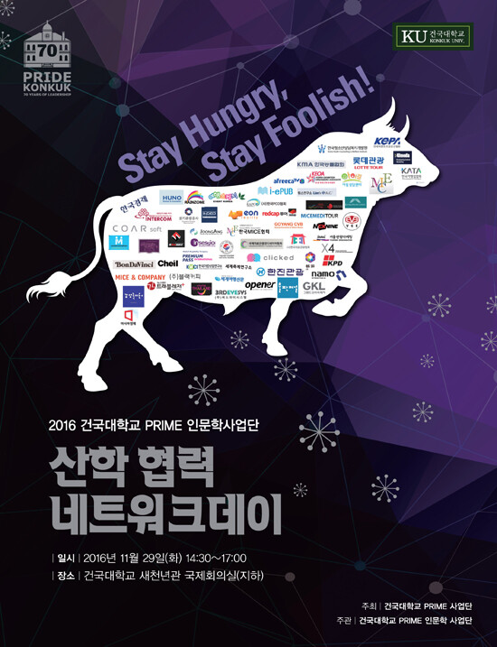 건국대학교 프라임 인문학사업단은 학생들의 인문학 전공능력과 진로 역량을 강화하기 위해 40여개 국내 최고 인문학 관련 산학협력기업과 전문기관이 참여하는 ‘2016 건국대학교 프라임 인문학사업단 산학협력 네트워크데이’를 29일(화) 오후 2시부터 교내 건국대 새천년관 국제회의장에서 개최한다.