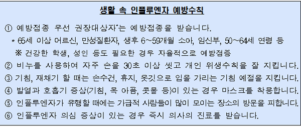 교육부와 보건복지부 질병관리본부가 제시한 예방수칙은 30초 이상 손씻기와 기침예절 지키기를 비롯해 ▲예방접종 우선 권장대상자(65세 이상 어르신, 만성질환자, 생후 6∼59개월 소아, 임신부, 50∼64세 연령 등)의 예방접종 ▲발열과 호흡기 증상(기침, 목 아픔, 콧물 등) 시 마스크 착용 ▲인플루엔자 유행 시 사람들이 많이 모이는 장소 방문 자제 등이다.