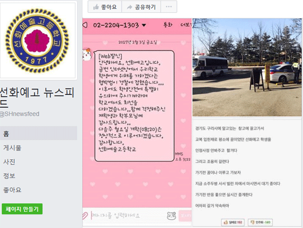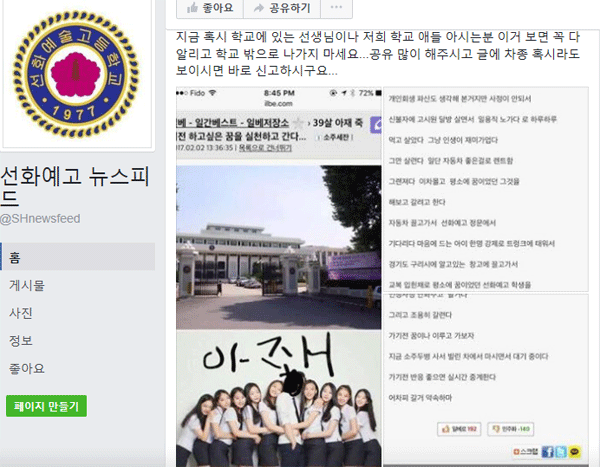 지난 1일 오후 9시 23분 선화예고 페이스북인 선화예고 뉴스피드에 한 일베 회원이 작성한 글이라며 익명의 제보글이 올라 왔다. 해당 글에는 "일용직 노가다로 하루하루 먹고 살았다. 그냥 인생이 재미가 없다. 그만 살련다. 일단 자동차 좋은 걸로 렌트함. 그랜져다. 이 차 몰고 평소 꿈이었던 그것을 해보고 갈려고 한다. 자동차 끌고가서 선화예고 정문에서 기다리다 마음에 드는 아이 강제로 한 명 트렁크에 태워서 경기도 구리시에 알고 있는 창고로 끌고가서 교복 입힌 채로 평소 꿈이었던 선화예고 학생들을 인정사정 안 봐주고 할 거다'는 내용이 게재됐다.