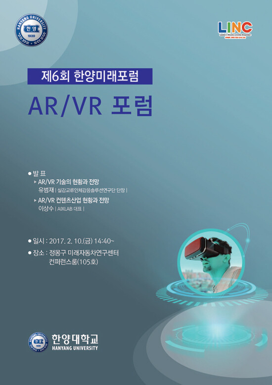 [대학저널 이원지 기자] 한양대학교(총장 이영무)는 오는 10일, 서울캠퍼스 정몽구미래자동차연구센터에서 미래포럼을 열고 AR(증강현실)·VR(가상현실) 기술과 콘텐츠산업의 발전방안을 모색한다.