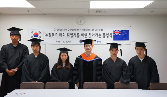 이날 해외 졸업식에는 뉴질랜드에서 해외 인턴과정을 마치고 현지의 자동차정비회사에 취업한 졸업생 5명이 참석했다. 이들은 지난 8일 아주자동차대학 본교에서 열린 졸업식의 신성호 아주자동차대학 총장 축사 영상을 함께 시청하고 류지호 기획처장으로부터 학위증서를 받았다.