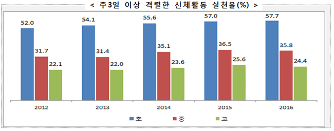 신체활동 지표 중 '주 3일 이상 격렬한 신체활동(숨이 차거나 땀이 날 정도의 운동) 비율'은 초등학교에서 최근 5년간 지속적으로 증가 추세를 보였으나 중학교와 고등학교에서는 증감이 반복됐다. 한 마디로 초등학교에서 중학교, 고등학교에 올라갈수록 패스트푸드 등을 많이 섭취하는 대신 과일과 채소 등은 적게 섭취하고, 운동은 적게 하는 것으로 나타났다.