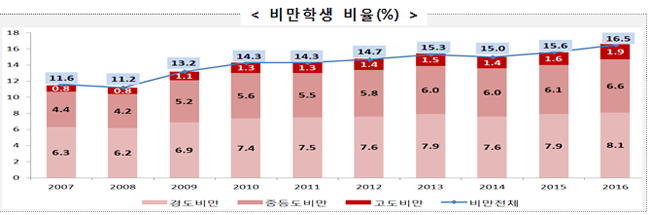 평균 몸무게는 모든 학교급에서 10년간 소폭 증가했다. 이에 전체 학생들의 비만율이 16.5%를 기록, 전년도(15.6%)에 비해 0.9%p 증가했다. 지역별로는 농어촌(읍·면) 지역이 도시지역보다 비만율이 높게 나타났다.