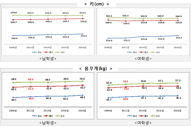 신체발달 상황부터 살펴보면 평균 키는 초 6학년 남학생의 경우 152.1㎝로 2011년 150.4㎝보다 1.7㎝, 2006년 150.0㎝보다 2.1㎝ 커졌다. 중 3학년 남학생 역시 170.0㎝로 2011년 168.9㎝보다 1.1㎝, 2006년 168.7㎝보다 1.3㎝ 커졌다. 그러나 고 3학년 남학생의 경우 173.5cm로 2011년 173.7㎝보다 0.2㎝, 2006년 174.0㎝보다 0.5㎝ 작아졌다.