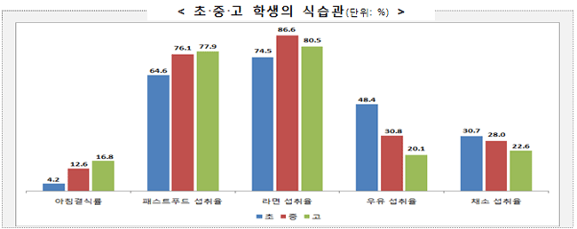 건강 조사 결과 영양 및 식습관 지표 중 '주 1회 이상 음료수 섭취율'과 '주 1회 이상 패스트푸드(햄버거·피자·튀김 등) 섭취율', '아침식사를 거르는 비율'이 고학년일수록 높게 나타났다. '주1회 이상 라면 섭취율'도 학년이 올라갈수록 증가했지만 고등학교에서는 오히려 감소했다. '우유·유제품 매일 섭취율', '과일 매일 섭취율', '채소 매일 섭취율'의 경우 학년이 올라갈수록 감소세가 뚜렷했다.