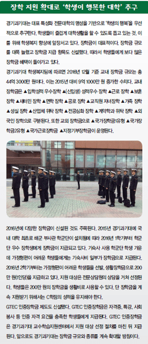 이 밖에 경기과기대는 SCK 사업을 수행하며 △기초학습능력향상프로그램 운영 △e-러닝 관리시스템 구축 △학생이력관리시스템 도입 △GTEC 인증제 시행 등 다양한 성과를 달성했다. 이러한 성과에 힘입어 2014년 73%의 취업률을 기록한 데 이어 2015년 1차 유지 취업률 90.7%를 달성했다.