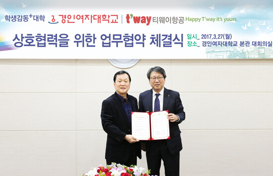 [대학저널 유제민 기자] 경인여자대학교(총장 김길자)는 27일 경인여대 본관 대회의실에서 (주)티웨이항공과 산학협력 협약식을 가졌다.