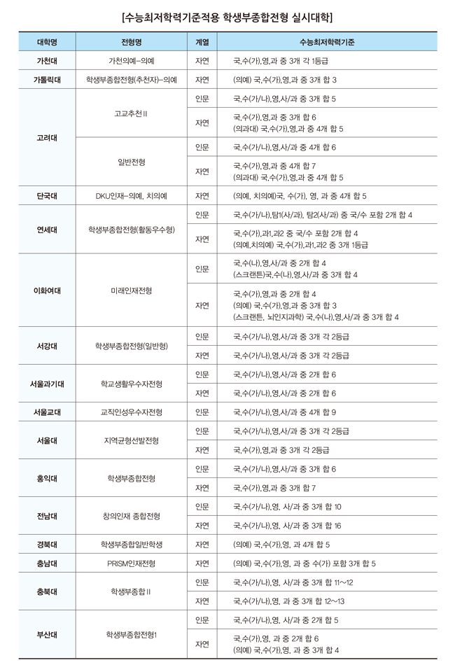 학생부종합전형 실시 대학 가운데 수능최저학력기준 적용 대학은 수도권에서 의예과를 제외하면 8개교, 지방 거점 국립대 5개교로 대부분 대학이 수능최저학력기준을 적용하고 있지 않습니다. 교과 성적이 우수하지만 비교과 활동이 다소 미흡하고, 수능 준비를 소홀히 하지 않는다면 내신 성적 범위를 고려해 수능최저학력기준 적용 대학에 지원하는 전략을 세워 준비하는 것도 도움이 될 수 있습니다.