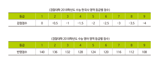특히 경찰대학은 한국사의 중요성을 감안, 수능 한국사 영역의 경우 기존 4등급부터 감점했지만 올해 2등급부터 감점한다. 점수편차도 0.4점에서 0.5점으로 올린다. 또한 올해 수능부터 영어 영역이 절대평가로 전환됨에 따라 경찰대학은 등급 간 4점의 편차를 적용할 예정이다.