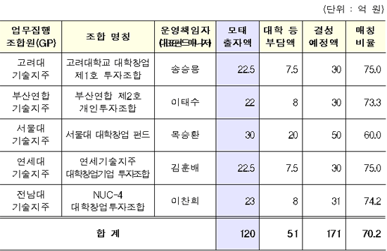 고려대기술지주, 부산연합기술지주, 서울대기술지주, 연세대기술지주, 전남대기술지주에서 운용하는 조합이 대학창업펀드에 선정됐다.