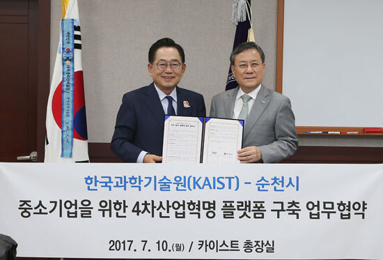 KAIST는 순천시와 10일 KAIST 본관 2층 총장실에서 '중소기업 4차 산업혁명 플랫폼 구축 업무협약'을 체결했다.