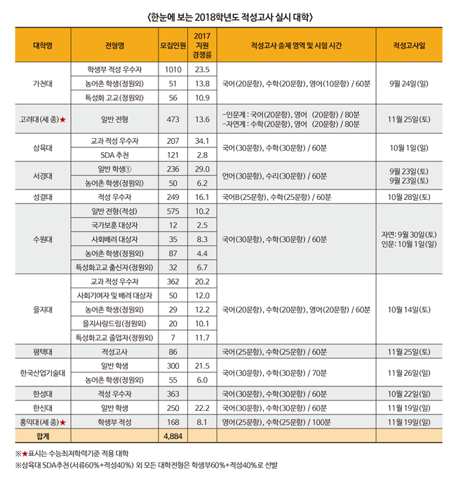 [대학저널 신효송 기자] 2017학년도 대입전형에서 가천대·서경대·한신대 등 10개 대학이 4472명을 선발하는 데 활용되었던 적성고사를 2018학년도 대입전형에서는 평택대와 한성대가 새롭게 실시해 12개 대학에서 4884명을 선발하는 데 활용된다.(대학별 2018학년도 수시 모집요강 기준) 이는 2017학년도 대입전형보다 2개 대학 412명을 더 선발하는 것이다. 적성고사가 모두 수시모집에서만 실시한다는 점을 고려할 때 중·하위권 수험생들의 수시 지원 기회가 그만큼 넓어졌다고 볼 수도 있다. <대학저널>이 2018학년도 대입 적성고사의 모든 것을 소개한다.