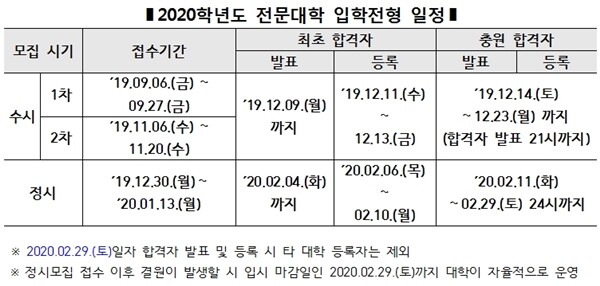 2020학년도 전문대학 수시 1차모집은 2019년 9월 6일부터 27일까지, 수시 2차모집은 2019년 11월 6일부터 20일까지 실시한다. 정시모집은 2019년 12월 30일부터 2020년 1월 13일까지 진행된다. 모든 전문대학들의 전형 일정은 동일하다.