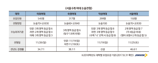 올해 덕성여대가 논술전형을 신설해 기존 이화여대, 숙명여대, 서울여대까지 총 4개 대학에서 논술고사를 치른다. 논술전형일은 4개 대학 모두 수능 이후이다. 수능최저학력기준을 적용한다.