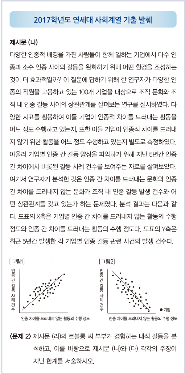 연세대, 성균관대에서 출제되는 유형이다. 도표, 통계자료, 그래프를 분석한 후 서로 다른 두 주장(해석)을 비교, 차이점을 분석, 그에 대한 입장을 서술하는 논제 등이 출제된다. 수험생의 논리적 분석 능력과 더불어 사고의 표현 능력까지 평가하는 것으로 인문논술에서 가장 어려운 유형이라고 할 수 있다.