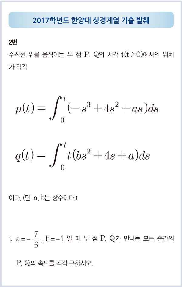 한양대 상경계열은 수능 수학 나형 범위에서 출제한다. 한양대 상경계열을 목표로 하는 수험생은 자연계열 수학 논술을 대비하는 것과 같이 수능 수학 공부를 하면서 답을 구하는 과정을 따로 정리하는 연습이 필요하다.