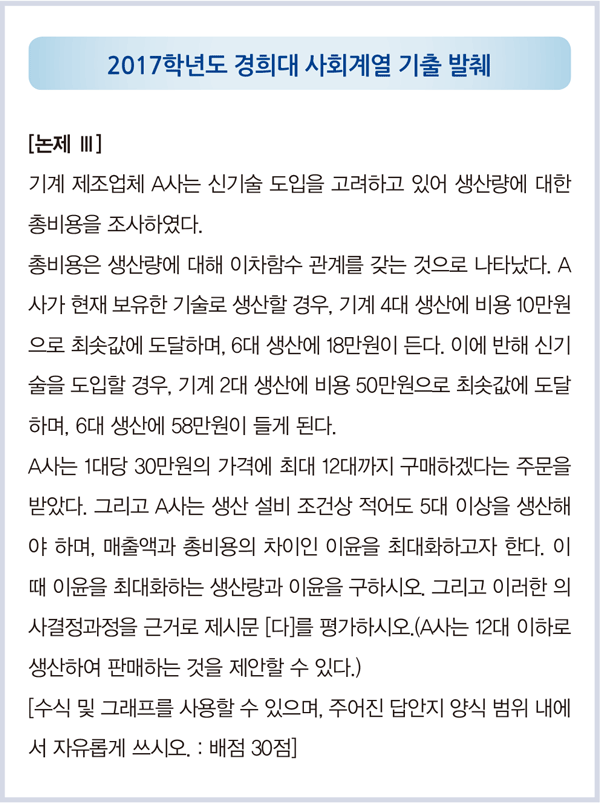 경희대, 건국대, 중앙대에서 출제되는 유형이다. 사회, 경제적인 내용의 지문을 읽고 수학 교과적 내용을 활용하여 문제를 해결해야 한다. 이 유형은 학생들이 평소에 접하는 '문장제 문제'와 유사하다. 사회, 경제적인 내용에 대한 수학적 분석에 많이 사용하는 연립일차방정식의 해, 부등식의 영역, 이차함수의 최대·최소, 도함수의 활용 부분에 대한 학습이 시험을 대비하는 데 도움이 될 수 있다.