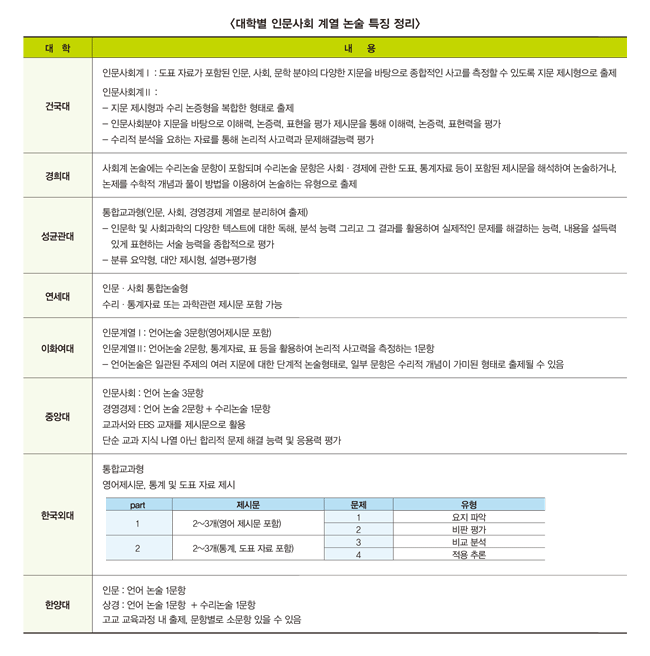 인문사회계열 수리논술은 네 가지 유형으로 나눌 수 있는데 수학 교과형, 도표 및 통계자료 분석형, 도표 및 통계자료 해석형, 자연계열 수학논술형이다.
