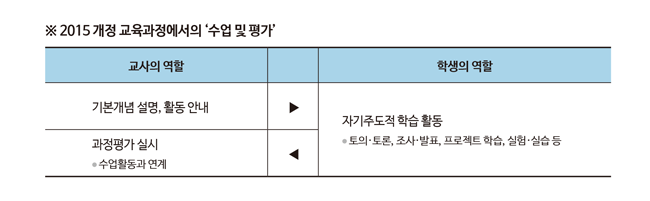 개정 교육과정에서 평가에서 중점적인 사항을 살펴보면, 학생들이 수업에 능동적으로 참여하려는 태도와 열정, 즉 과정을 통해 성장하는 과정을 기록하고 평가하려는 것을 알 수 있다. 또 평가의 결과를 토대로 학생의 성장을 조력할 수 있도록 과정 중심 평가를 강화할 것을 강조하고 있다. 즉 ‘무엇을 배웠는가’ 뿐만 아니라 ‘어떤 경험을 했는지’에 주목하는 방향으로 평가가 확대되는 것이다. 이러한 과정에서 각 교과가 제시하는 역량을 함양하기 위한 과제가 제시되고, 과제를 수행하는 학습의 과정에서 평가가 자연스럽게 이뤄지게 된다.
