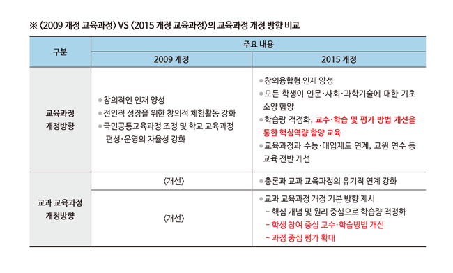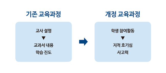 그동안 교실에서 진행됐던 수업의 중심 요소가 ‘교과서의 내용’, ‘진도’, ‘교사의 설명’이었다면, 개정 교육과정에서는 ‘수업 참여활동’을 통해 학습의 중심에 학생 개개인의 ‘지적 호기심’, ‘사고력’ 등이 자리 잡을 수 있도록 했다.