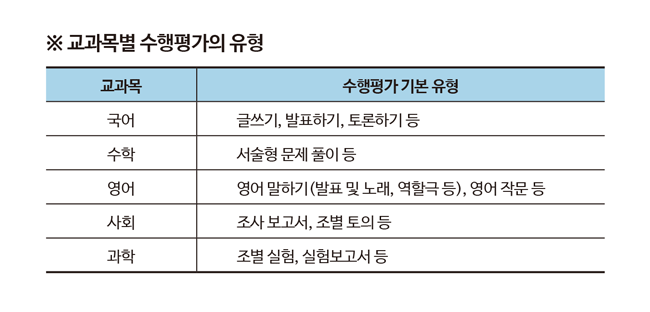 수행평가는 학생들이 해당 지식을 알고 있는지를 평가하기보다 교과 내용을 얼마나 잘 이해하고 설명할 수 있으며 배운 것을 직접 실행할 수 있는지를 평가한다. 발표나 토론 참여, 과제 제출뿐만 아니라 수업에서의 태도까지도 평가에 포함된다. 수업 준비물, 수업시간 중의 태도, 예습 및 복습 상태부터 연구 보고서, 발표 및 토론 수행 능력 등 다양한 형태가 수행평가의 도구로 활용되는 만큼 학교에서 이루어지는 전 과정을 성실히 준비해야만 할 것이다. 특히 수행평가는 각 교과 과정의 특징에 맞게 수업 안에서 진행된다. 따라서 교과목별 수행평가 유형에 대한 파악을 어느 정도 해두고 이에 대한 대비를 진행하는 것이 좋다.