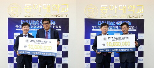 이 회장과 윤 회장은 지난 19일 오전 동아대 승학캠퍼스를 방문해 1000만 원씩 발전기금을 기부했다. 발전기금 기부식에는 한석정 총장과 황규홍 대외협력처장, 최형림 경영대학장 등이 참석했다.