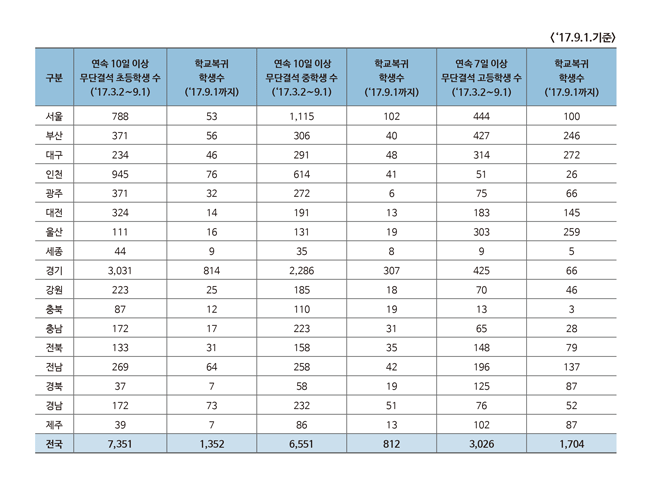 학교급별로는 초등학생이 7351명으로 가장 많았다. 중학생과 고등학생이 각각 6551명, 3026명이었다. 10일 이상 무단결석 학생들 가운데 지난 9월 1일 기준 3868명만이 학교로 복귀했다. 초등학생과 중학생 211명을 대상으로는 교육당국이 경찰에 수사 의뢰했고 8명은 아직까지 소재가 파악되지 않고 있다.