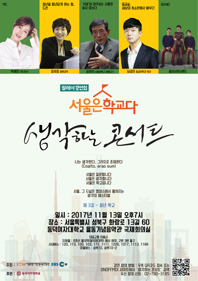 [대학저널 신효송 기자] EBS가 오는 13일 오후 7시 동덕여자대학교(총장 김낙훈)에서 ‘소통과 공감’의 릴레이 강연 프로그램 ‘EBS 생각하는 콘서트 – 서울은 학교다’(이하 생각하는 콘서트)의 세 번째 강연을 진행한다.