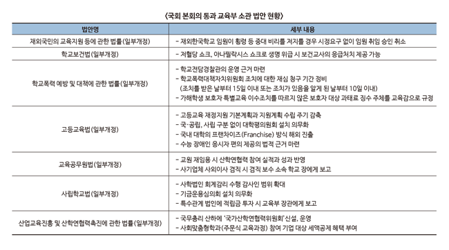 교육부에 따르면 의결 법안은 ▲재외국민의 교육지원 등에 관한 법률(일부개정) ▲학교보건법(일부개정) ▲학교폭력 예방 및 대책에 관한 법률(일부개정) ▲고등교육법(일부개정) ▲교육공무원법(일부개정) ▲사립학교법(일부개정) ▲산업교육진흥 및 산학연협력촉진에 관한 법률(일부개정)이다.