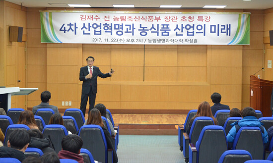 [대학저널 유제민 기자] 경북대학교(총장 김상동) 농업생명과학대학은 22일 김재수 전 농립축산식품부 장관을 초청, 농생대 와성홀에서 '4차 산업혁명과 농식품 산업의 미래'에 관한 주제로 특강을 개최했다.