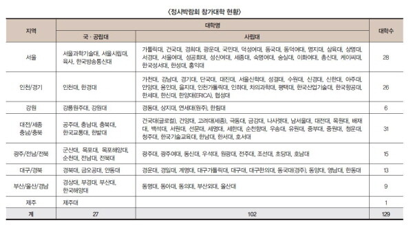 “11월 23일 기준으로 전국에서 129개 대학이 참가합니다. 참가 대학 명단은 아래 표를 참고하기 바랍니다. 단 참가 대학은 추후 변동될 수 있습니다.”