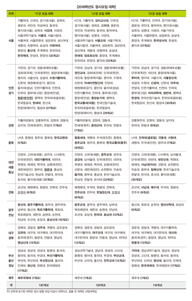 2018학년도 정시모집군별 대학과 모집 정원을 한국대학교육협의회가 발표한 ‘2018학년도 대입전형 시행계획’을 기준으로 살펴보면 ‘가’군에서는 서강대·서울대·이화여대 등 130개 대학이 32,337명을 선발한다. ‘나’군에서는 고려대·연세대·한양대 등 129개 대학이 35,068명을, ‘다’군에서는 건국대·중앙대·홍익대 등 116개 대학이 25,163명을 선발한다. 이 중 동국대·성균관대·한국외대 등 130개 대학은 모집계열 또는 모집단위에 따라 분할 모집으로 선발한다.