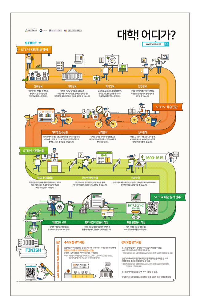 이에 교육부와 대교협은 ▲진로정보(커리어넷) ▲대학의 주요정보(대학알리미) ▲입학정보를 통합, 대입정보포털 ‘어디가(www.adiga.kr)’를 운영하고 있습니다. 이를 통해 수험생, 학부모, 교사가 보다 쉽고 간편하게 정보를 수집할 수 있도록 도움을 주고 있습니다. ‘어디가’는 ‘①진로정보 탐색 → ②대입정보 검색 → ③학습진단 → ④대입상담’순으로 활용하면 더욱 효과적입니다.