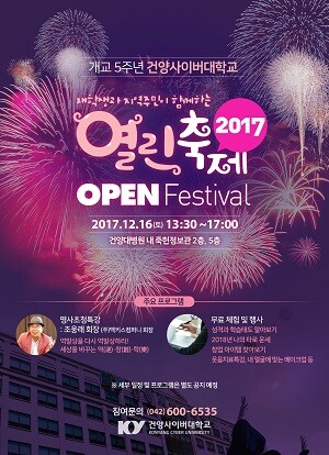 [대학저널 임지연 기자] 건양사이버대학교(총장 이원묵)가 오는 12월 16일 건양대 대전메디컬캠퍼스 죽헌정보관에서 ‘OPEN FESTIVAL’을 개최한다.