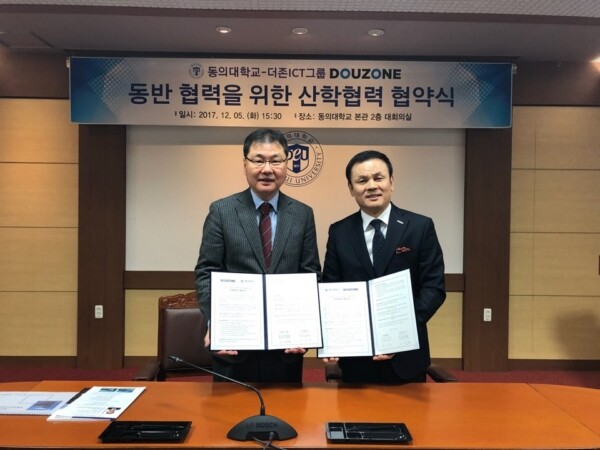 [대학저널 박용우 기자]동의대학교(총장 공순진)는 지난 5일 본관 2층 회의실에서 더존ICT그룹(회장 김용우)과 양 기관의 상호발전과 재학생의 인턴십 등 전문인력 양성을 위한 산학협력 협약을 체결했다.