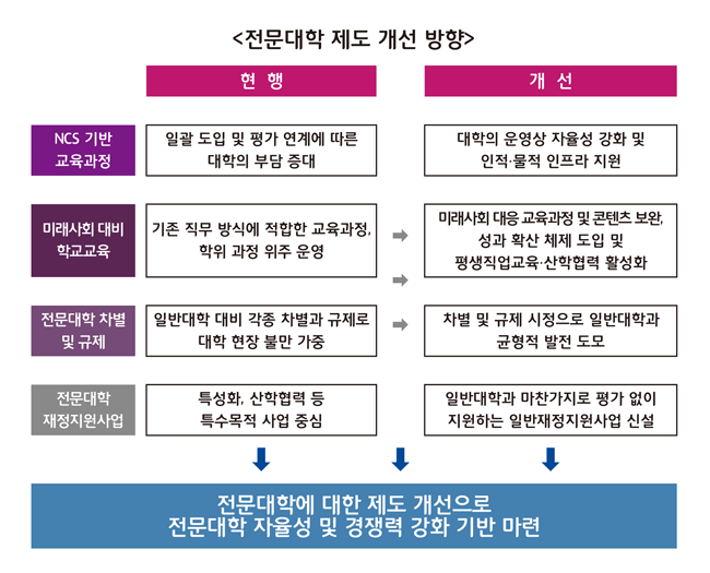 NCS 기반 교육과정 제도 개선은 전문대학의 자율성 강화에 초점이 맞춰진다. 앞서 박근혜 정부는 능력중심사회 실현을 목표로 NCS 도입을 추진했다. 특히 모든 전문대학들이 빠른 시일 내에, 일괄적으로 NCS를 도입하도록 대학재정지원사업과 대학구조개혁평가에 NCS 도입 여부와 실적을 연계시켰다.