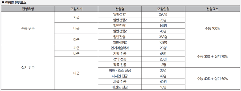 인문계, 자연계열 학과들은 전년과 같이 수능 100%로 총 1,028명을 선발한다. 실기에서는 음악학부, 연기예술학과는 수능 30%에 실기 70%로 선발하며, 미술·디자인학부, 체육학부는 수능 40%, 실기 60%로 선발한다. 모집인원은 수시모집 미충원, 등록포기 인원을 정시 모집인원에 포함하여 선발하므로 늘어날 수 있다.
