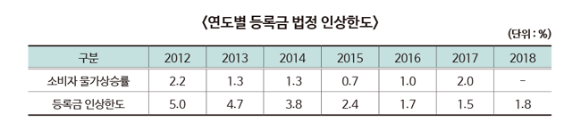 현재 '고등교육법' 제11조 7항에 따라 대학 등록금 인상률은 직전 3개 연도 평균 소비자 물가상승률의 1.5배가 적용된다. 소비자 물가상승률은 2015년 0.7%, 2016년 1.0%, 2017년 2.0%로 2015년부터 2017년까지 평균 소비자 물가상승률은 1.2%다. 따라서 2018학년도 대학 등록금 인상률은 2015년부터 2017년까지 평균 소비자 물가상승률(1.2%)의 1.5배인 1.8%다.