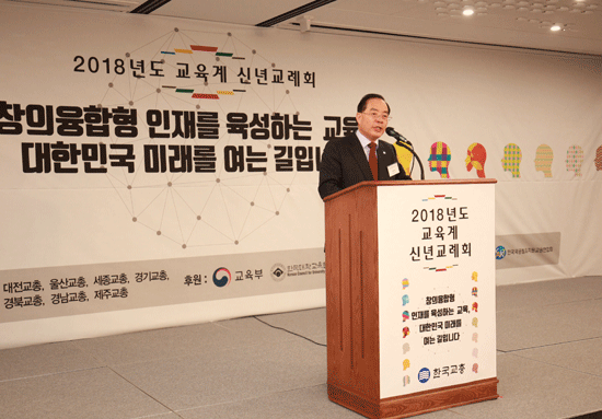 하윤수 교총 회장은 환영 인사에서 "무술년에는 우리 교육이 큰 신뢰와 사랑 속에 변함없이 대한민국 미래를 여는 디딤돌이 되기를 기대한다"면서 "대한민국이 오늘날 기적 같은 발전을 이룩할 수 있었던 것은 교육의 힘이었다. 지금도 교육에서 우리 미래를 찾아야 한다"고 말했다.