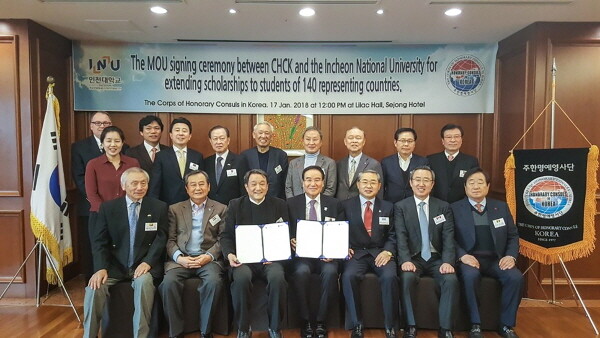 인천대 조동성 총장은 지난 17일 주한명예영사단(단장 김윤식 마다가스카르영사) 총회에서 148개국의 주한 명예대사가 추천하는 각국의 학생들에 대해 4년 장학금을 지급하는 양해각서를 영사단과 체결했다.