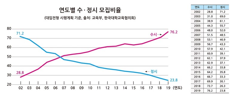 1994년 수능 도입 후 2000년 대 초반까지는 정시가 대세였다. 2002년 기준 선발비율은 정시 71.2%, 수시 28.8% 수준이었다. 이후 ‘정시축소, 수시확대’ 교육정책이 추진되면서 2007년 처음으로 수시 선발비율이 정시를 넘어섰고 현재 정시 선발비율은 23.8%에 머물러 있다.