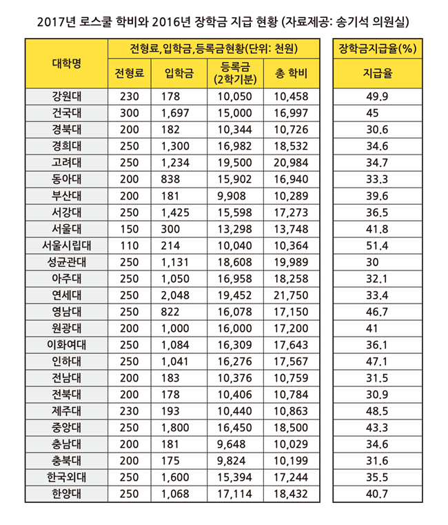 국회 교육문화체육관광위원회 송기석 의원이 교육부로부터 받은 ‘2017 로스쿨 전형료, 입학금, 등록금 현황’을 살펴보면 사립대 로스쿨의 평균 학비는 1829만 원이다. 비싼 대학은 2000만 원을 넘어선다. 학비에 상응하는 장학금을 지급한다고 하지만 이 또한 녹록치 않다. 같은 자료에 나온 ‘2016년 로스쿨 장학금 지급 현황’을 살펴보면 전국 25개 로스쿨의 평균 장학금 지급률은 36.9%에 불과하다. 반대로 학자금 대출을 받는 로스쿨 학생의 비중은 2009년 13.4%에서 2017년 33.4%로 증가했다.