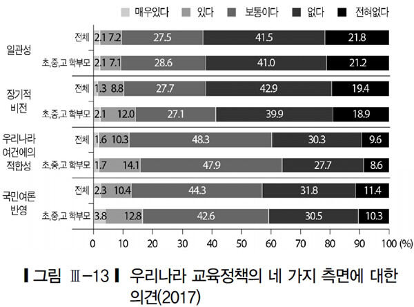 최근 한국교육개발원(KEDI)은 '2017년(12차) 교육여론조사(KEDI POLL 2017)' 결과를 공개했다. 조사 결과에 따르면 응답자들 중 63.3%가 우리나라 교육정책에는 '일관성이 없다(없다+전혀 없다)'고 답변한 것으로 나타났다. 또한 62.3%가 교육정책에 '장기적 비전이 없다(없다+전혀 없다)'고 답했다.