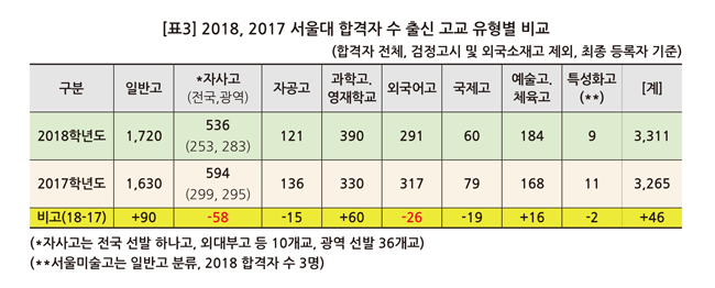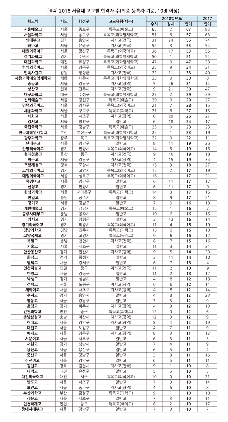 2018학년도 서울대 합격자 수가 10명 이상인 학교는 총 71개교로 나타났다. 이 가운데 특목고가 26개교(과학고·영재학교 12개교, 외국어고 8개교, 국제고 2개교, 예술고 4개교), 자사고 20개교(전국선발 9개교, 광역 선발 11개교), 일반고 25개교이다. 작년 대비 일반고는 4개교, 과학고·영재학교는 1개교 증가한 반면, 외국어고는 5개교, 국제고는 3개교가 감소했다.