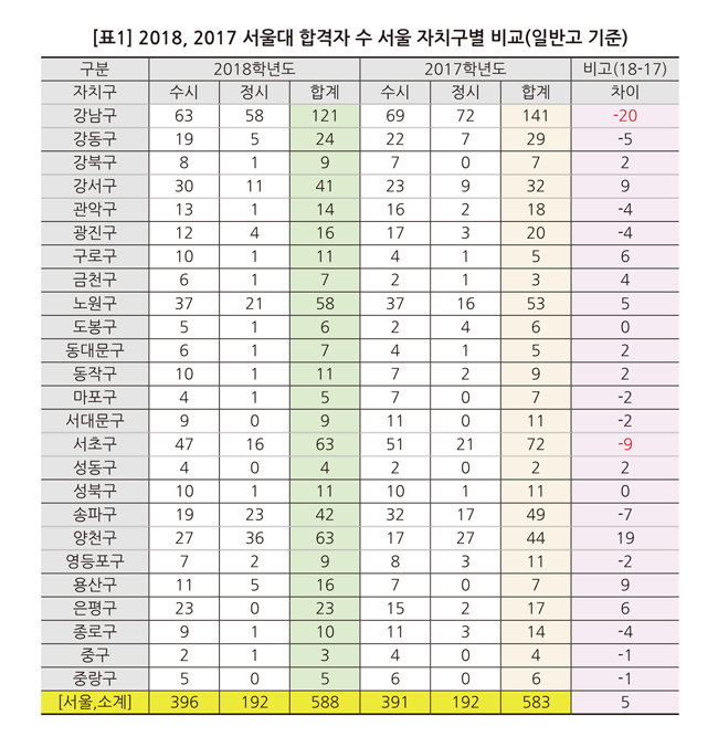 해당 자료에 따르면, 서울대 일반고 출신 합격자 수에서 서울 강남구(121명)가 전년 대비 20명 감소해 자치구별 감소 폭이 가장 컸다. 그 다음은 서초구(63명)로 전년 대비 9명 감소했다. 반면 양천구(63명)는 전년 대비 19명, 강서구(41명)는 9명 증가했다.