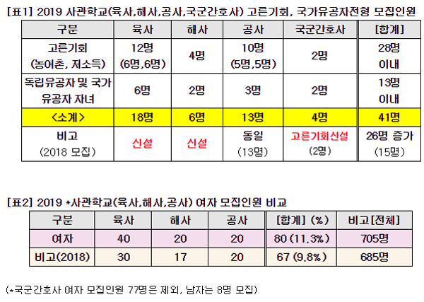 2019학년도 육군사관학교(이하 육사), 해군사관학교(이하 해사), 공군사관학교(이하 공사), 국군간호사관학교(이하 국군간호사) 모집요강에 따르면, 육사, 해사, 국군간호사의 고른기회 전형이 신설돼 각각 12명, 4명, 2명 이내를 선발한다. 독립유공자 및 국가유공자 자녀 전형도 육사, 해사에서 신설돼 각각 6명, 2명 이내를 선발한다. 육사, 해사에서는 여자 모집인원이 확대돼 육사는 종전 30명에서 올해 40명으로 10명 증가한다. 해사는 종전 17명에서 올해 20명으로 3명 증가했다. 공사는 2018학년도부터 고른기회전형 및 독립·국가유공자전형을 신설해 각각 10명, 3명 이내를 선발하고 있다.