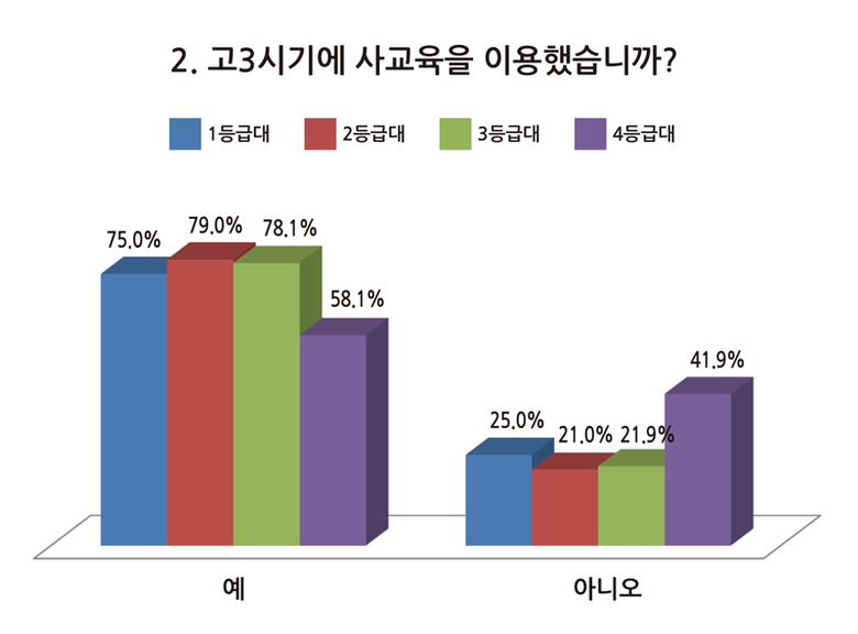 또한 사교육 이용 이유가 수능이라고 응답한 학생 가운데 1~3등급대는 평균 73.9%으로 나타났다. 4등급대 이하는 55.1%로 나타났다. 내신 때문이라는 응답자 가운데 1~3등급대는 평균 16.4%, 4등급대 이하는 32.9%로 차이가 났다. 진학사 측은 "수능 대비 사교육은 1~3등급대 학생 중심임을 알 수 있고, 수능 평균 4등급대 이하 학생들은 내신에 보다 집중하는 것"이라고 분석했다. 이는 덕성여대, 서울여대, 성신여대 등 서울지역 4년제 대학의 수능 최저학력기준이 평균 3등급대 이내라는 점과 일맥상통 한다고 덧붙였다.