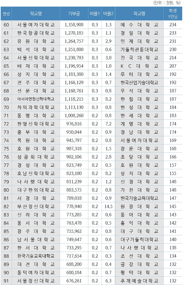 반면 하위 142개 대학의 기부금은 총 1992억 원(47.1%)이었다. 서울기독대(9727만 원), 가야대(9531만 6000원), 루터대(8635만 7000원), 창신대(8320만 8000원), 금강대(7260만 2000원) 등은 1억 원을 넘지 못했다.