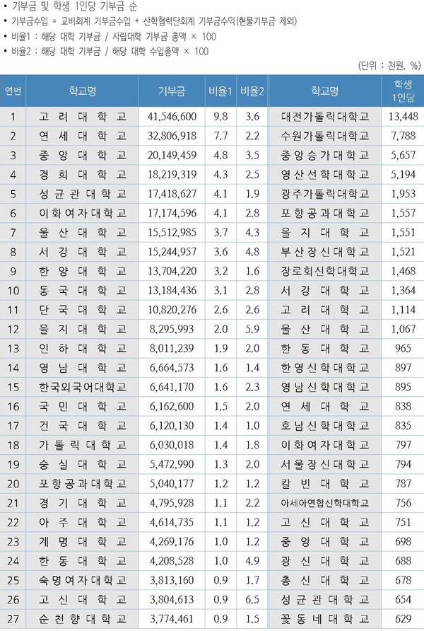 대학별로는 고려대가 415억 원(9.8%)으로 1위를 차지했다. 다음으로 연세대(328억 원), 중앙대(201억 원), 경희대(182억 원), 성균관대(174억 원), 이화여대(172억 원), 울산대(155억 원), 서강대(152억 원), 한양대(137억 원), 동국대(132억 원) 순이었다. 특히 고려대를 포함, 상위 10개 대학의 기부금은 총 2050억 원으로 전체 사립대 기부금의 48.4%를 차지했다.