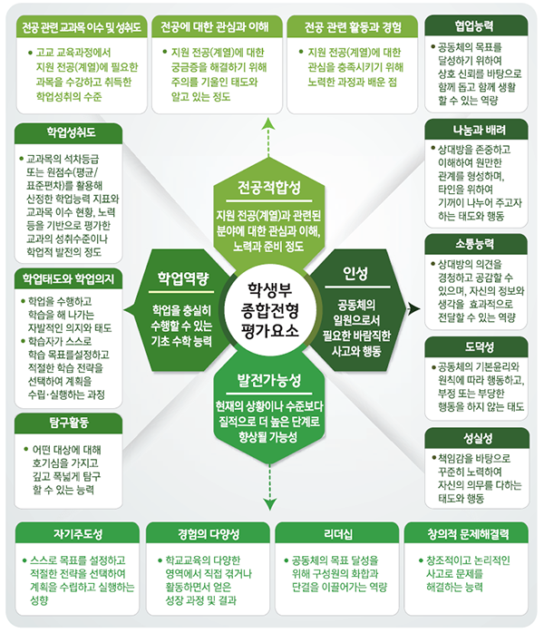 전공적합성은 기존 전공 관련 교과목 이수, 전공에 대한 관심과 이해도, 전공 관련 활동과 경험, 진로 탐색 노력, 적성과 소질 등 5개 평가항목을 전공 관련 교과목 이수 및 성취도, 전공에 대한 관심과 이해, 전공 관련 활동과 경험 등 3개 항목으로 변경했다.